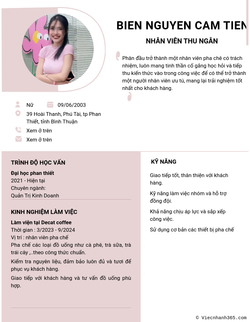 Xem hồ sơ ứng viên bien nguyen cam tien cần 2 điểm. Hồ sơ được cập nhật ngày: 15/11/2024
