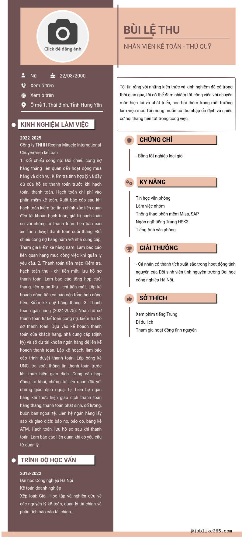 Xem hồ sơ ứng viên Bùi Lệ Thu cần 2 điểm. Hồ sơ được cập nhật ngày: 21/10/2025