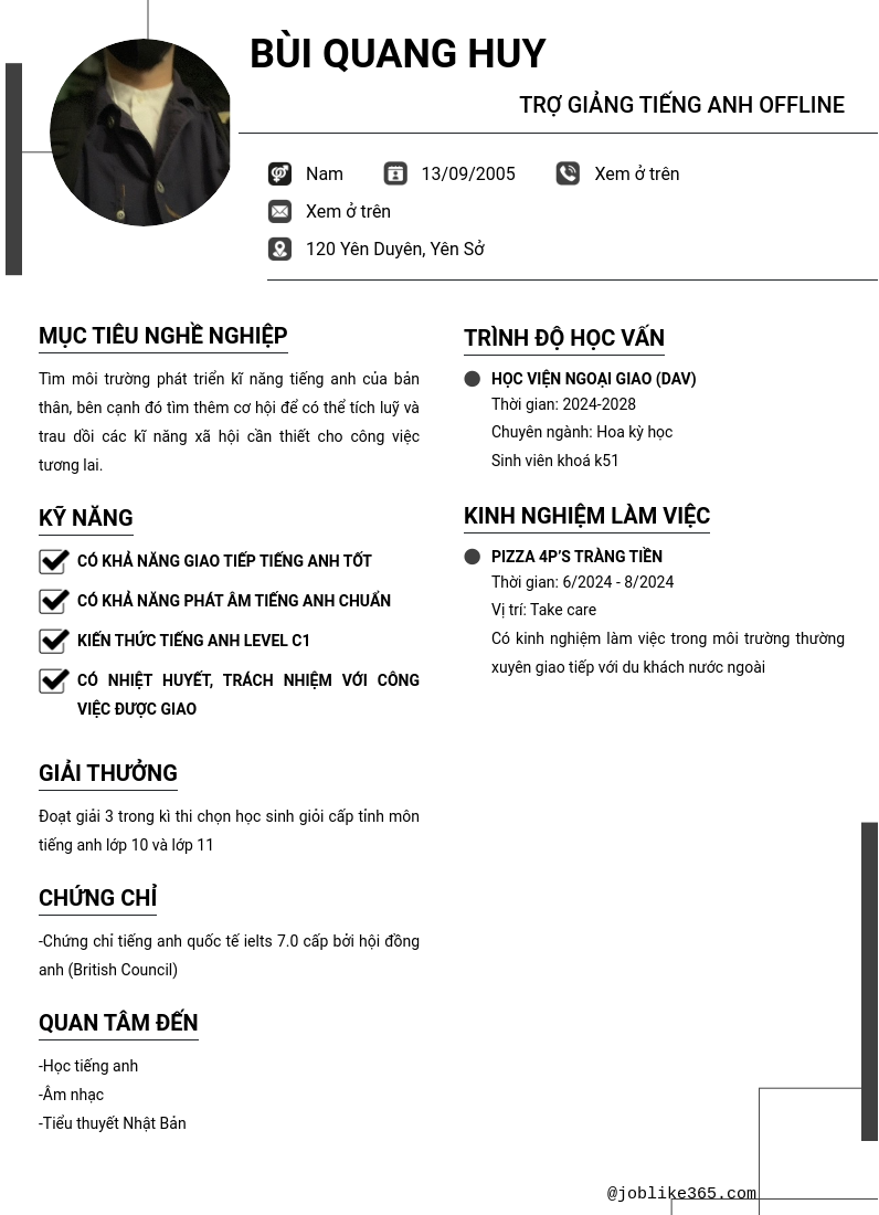 Xem hồ sơ ứng viên Bùi Quang Huy cần 2 điểm. Hồ sơ được cập nhật ngày: 29/08/2024