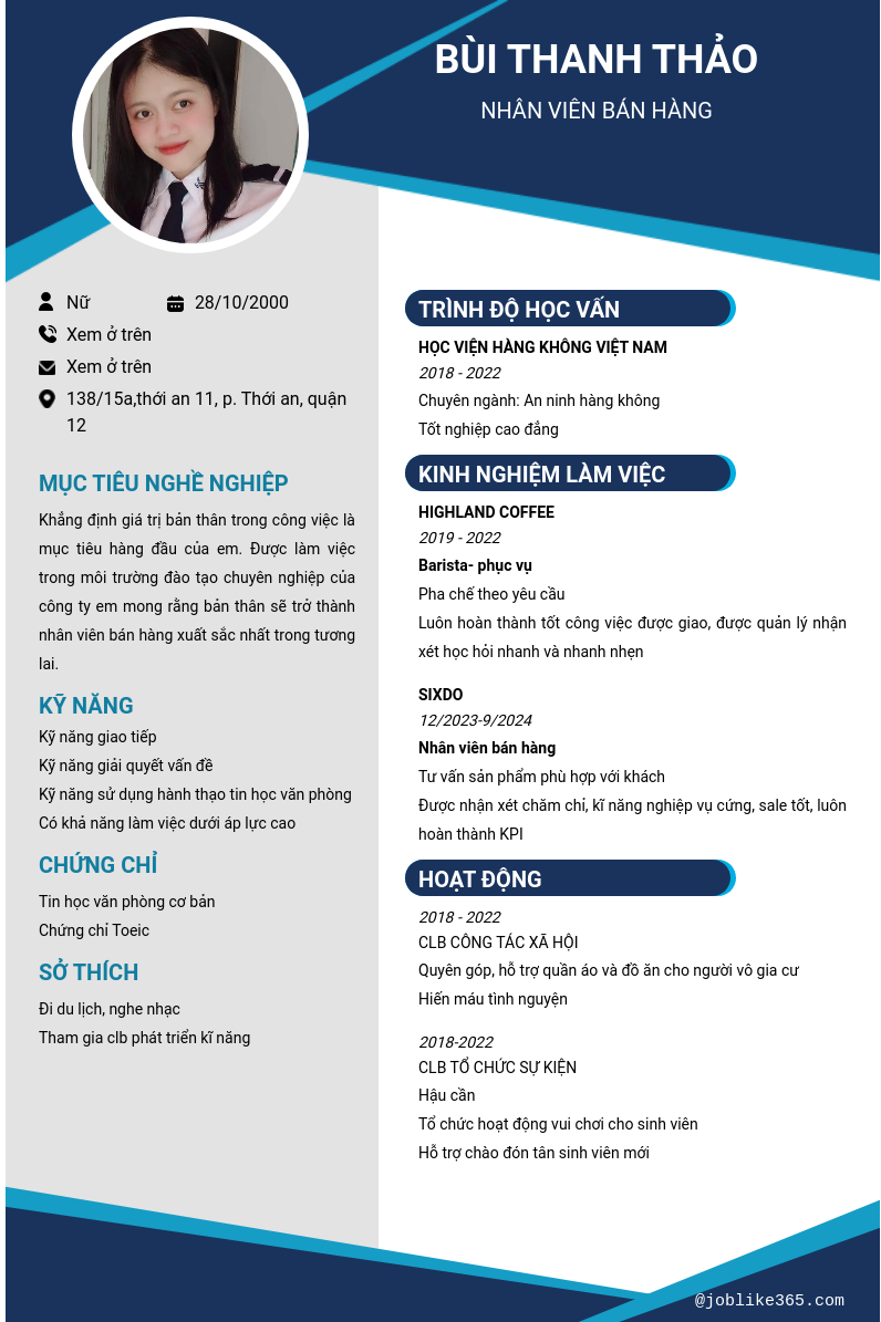 Xem hồ sơ ứng viên BÙI THANH THẢO cần 2 điểm. Hồ sơ được cập nhật ngày: 28/11/2024
