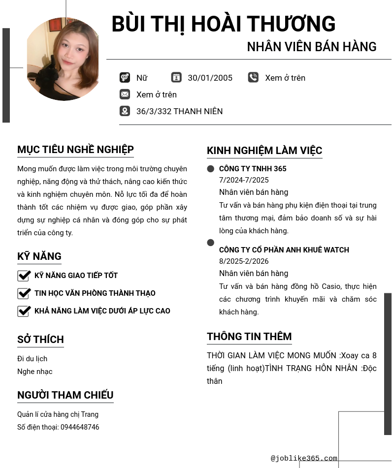 Xem hồ sơ ứng viên BÙI THỊ HOÀI THƯƠNG cần 2 điểm. Hồ sơ được cập nhật ngày: 08/02/2026