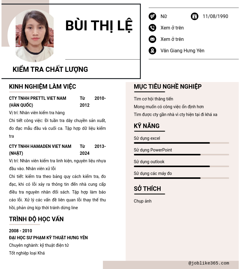 Xem hồ sơ ứng viên Bùi Thị Lệ cần 2 điểm. Hồ sơ được cập nhật ngày: 30/11/2024