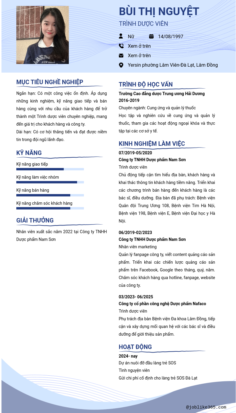Xem hồ sơ ứng viên Bùi Thị Nguyệt cần 2 điểm. Hồ sơ được cập nhật ngày: 16/08/2025