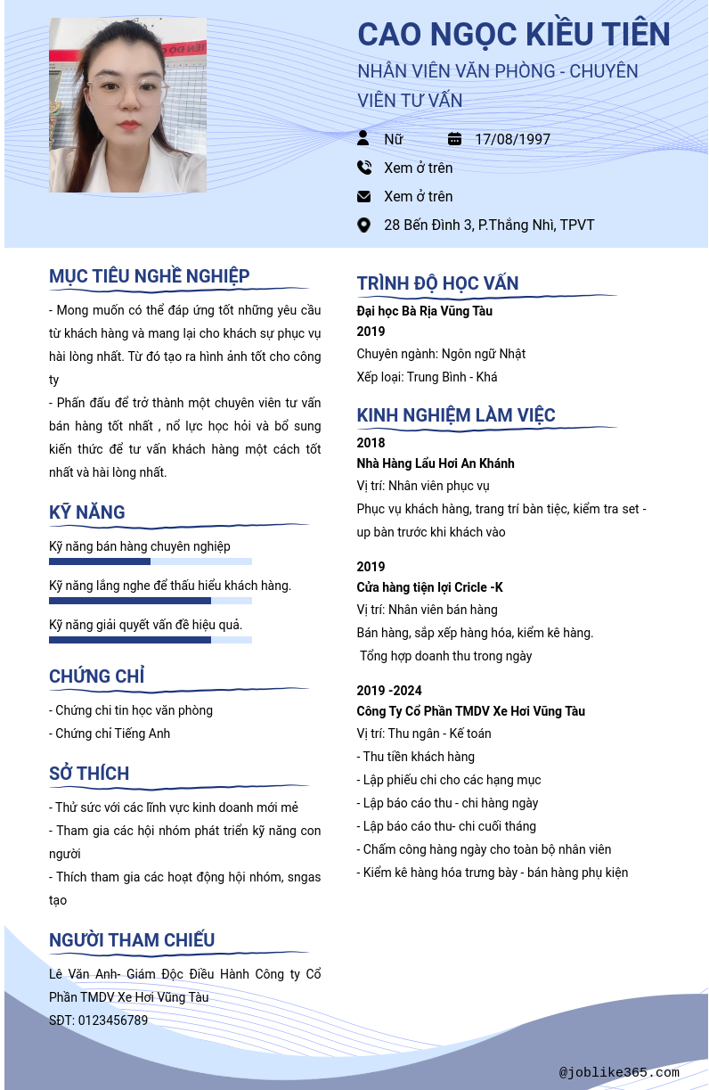 Xem hồ sơ ứng viên CAO nGỌC kIỀU tIÊN cần 2 điểm. Hồ sơ được cập nhật ngày: 12/09/2024