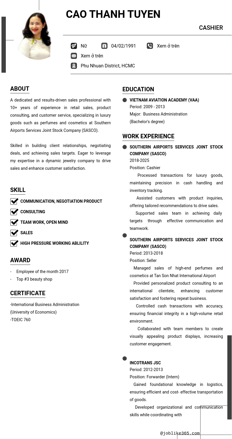 Xem hồ sơ ứng viên CAO THANH TUYEN cần 2 điểm. Hồ sơ được cập nhật ngày: 15/06/2025