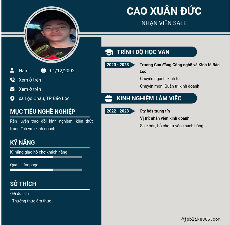 Xem hồ sơ ứng viên Cao Xuân Đức cần 2 điểm. Hồ sơ được cập nhật ngày: 08/08/2024