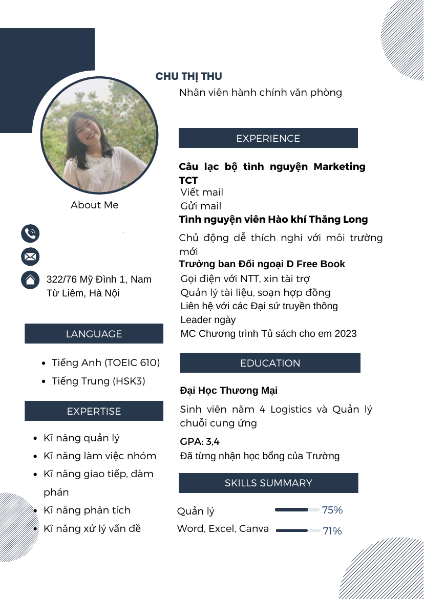 Xem hồ sơ ứng viên Chu Thị Thu cần 2 điểm. Hồ sơ được cập nhật ngày: 05/08/2024