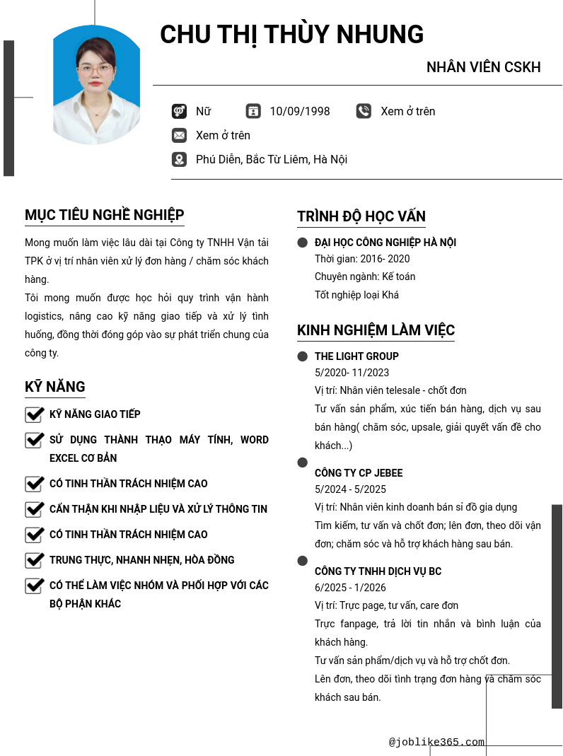 Xem hồ sơ ứng viên Chu Thị Thùy Nhung cần 2 điểm. Hồ sơ được cập nhật ngày: 04/03/2026