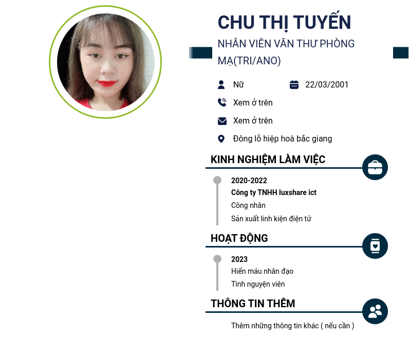 Xem hồ sơ ứng viên CHU THỊ TUYẾN cần 2 điểm. Hồ sơ được cập nhật ngày: 21/05/2024
