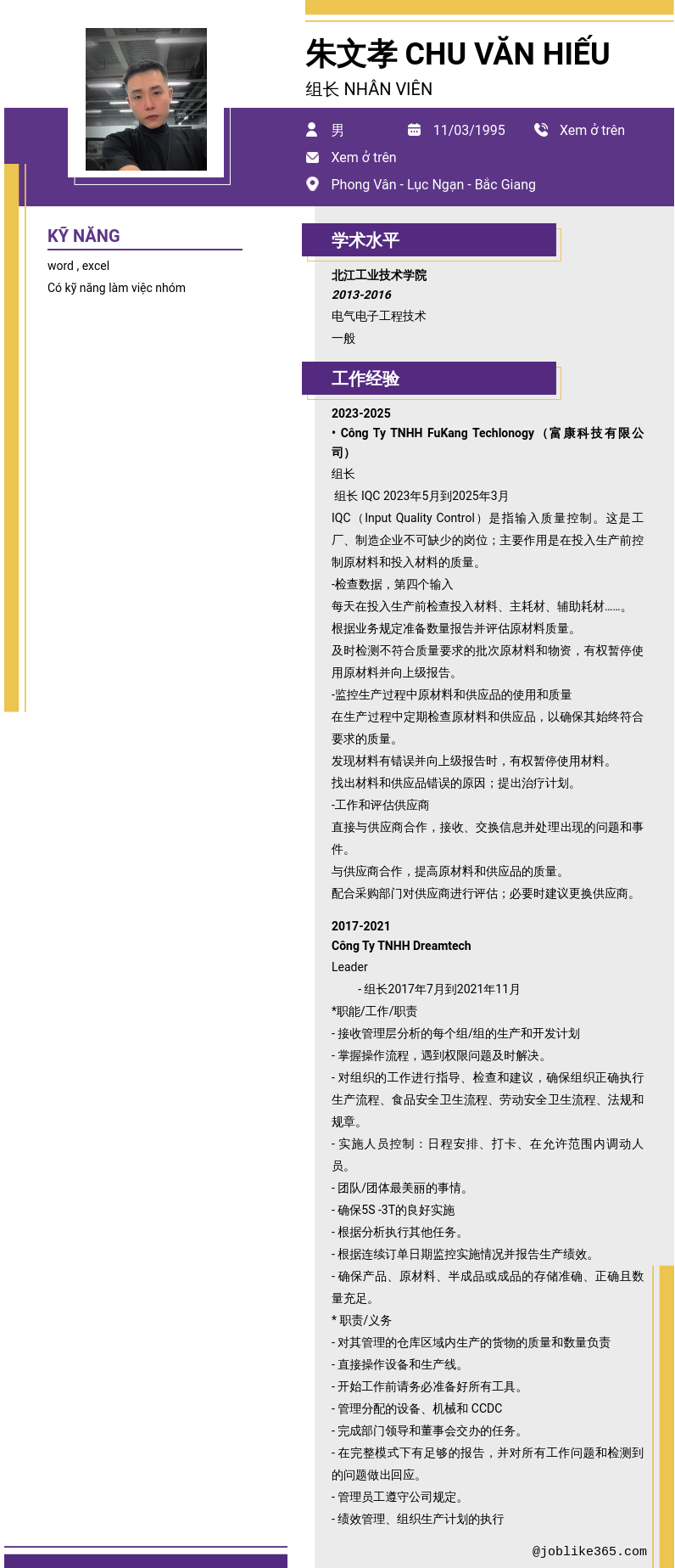 Xem hồ sơ ứng viên 朱文孝 CHU VĂN HIẾU cần 2 điểm. Hồ sơ được cập nhật ngày: 23/06/2025
