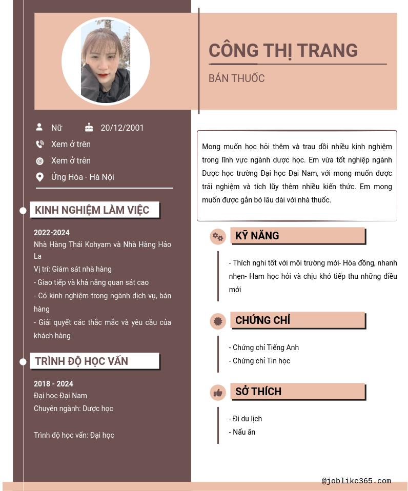 Xem hồ sơ ứng viên công thị trang cần 2 điểm. Hồ sơ được cập nhật ngày: 20/10/2024