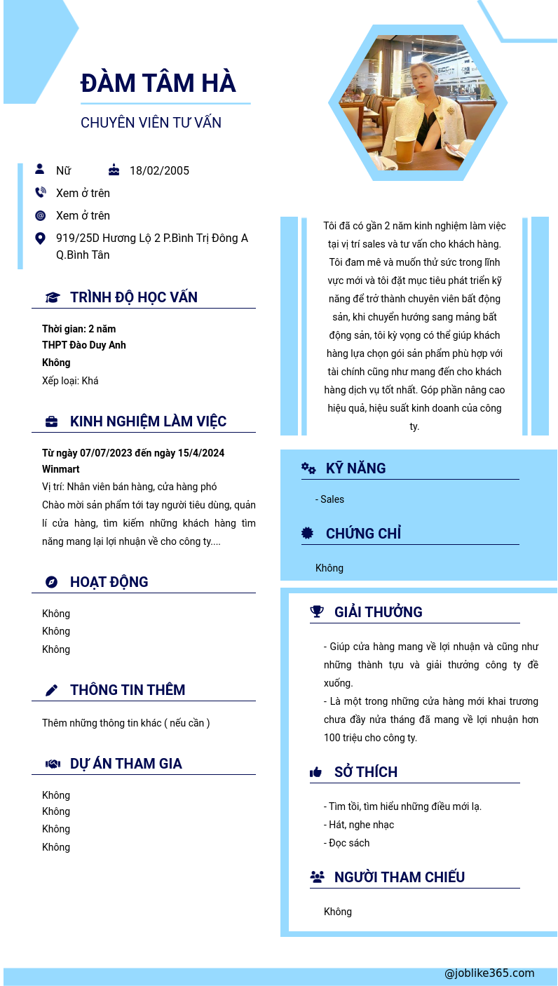 Xem hồ sơ ứng viên Đàm Tâm Hà cần 2 điểm. Hồ sơ được cập nhật ngày: 19/07/2024