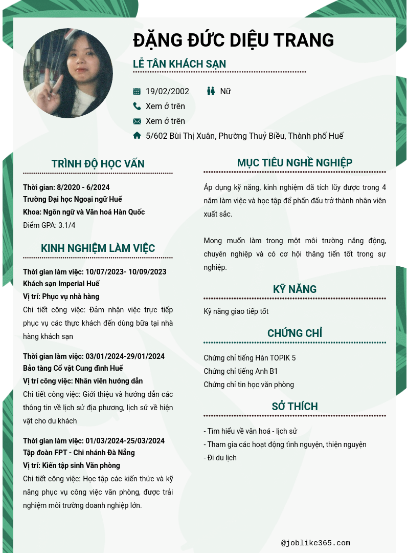 Xem hồ sơ ứng viên Đặng đức diệu trang cần 2 điểm. Hồ sơ được cập nhật ngày: 11/01/2025