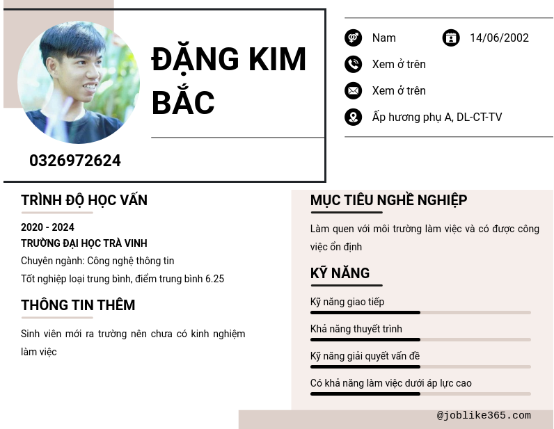 Xem hồ sơ ứng viên Đặng kim bắc cần 2 điểm. Hồ sơ được cập nhật ngày: 23/11/2024
