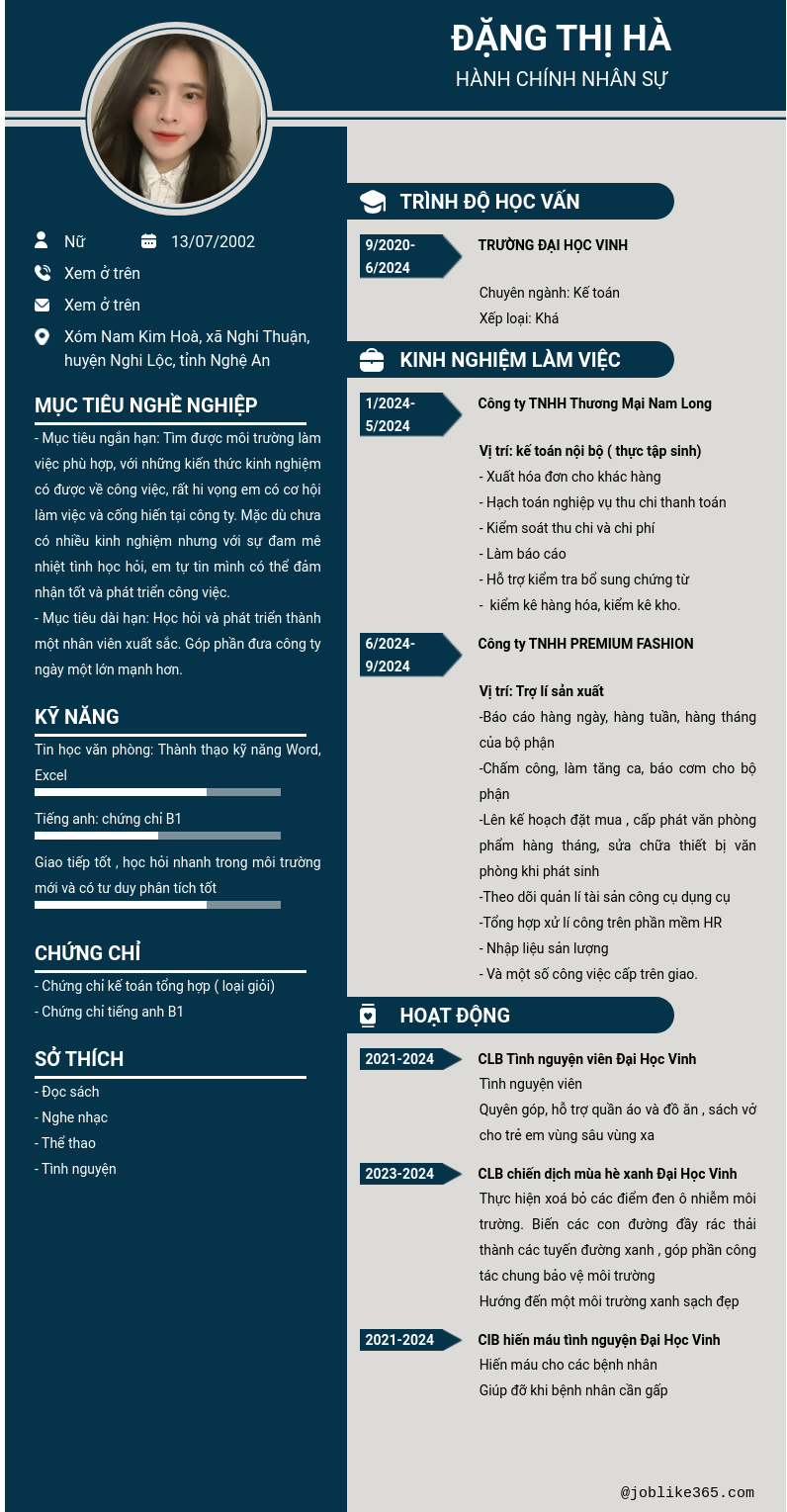 Xem hồ sơ ứng viên Đặng Thị Hà cần 2 điểm. Hồ sơ được cập nhật ngày: 01/10/2024