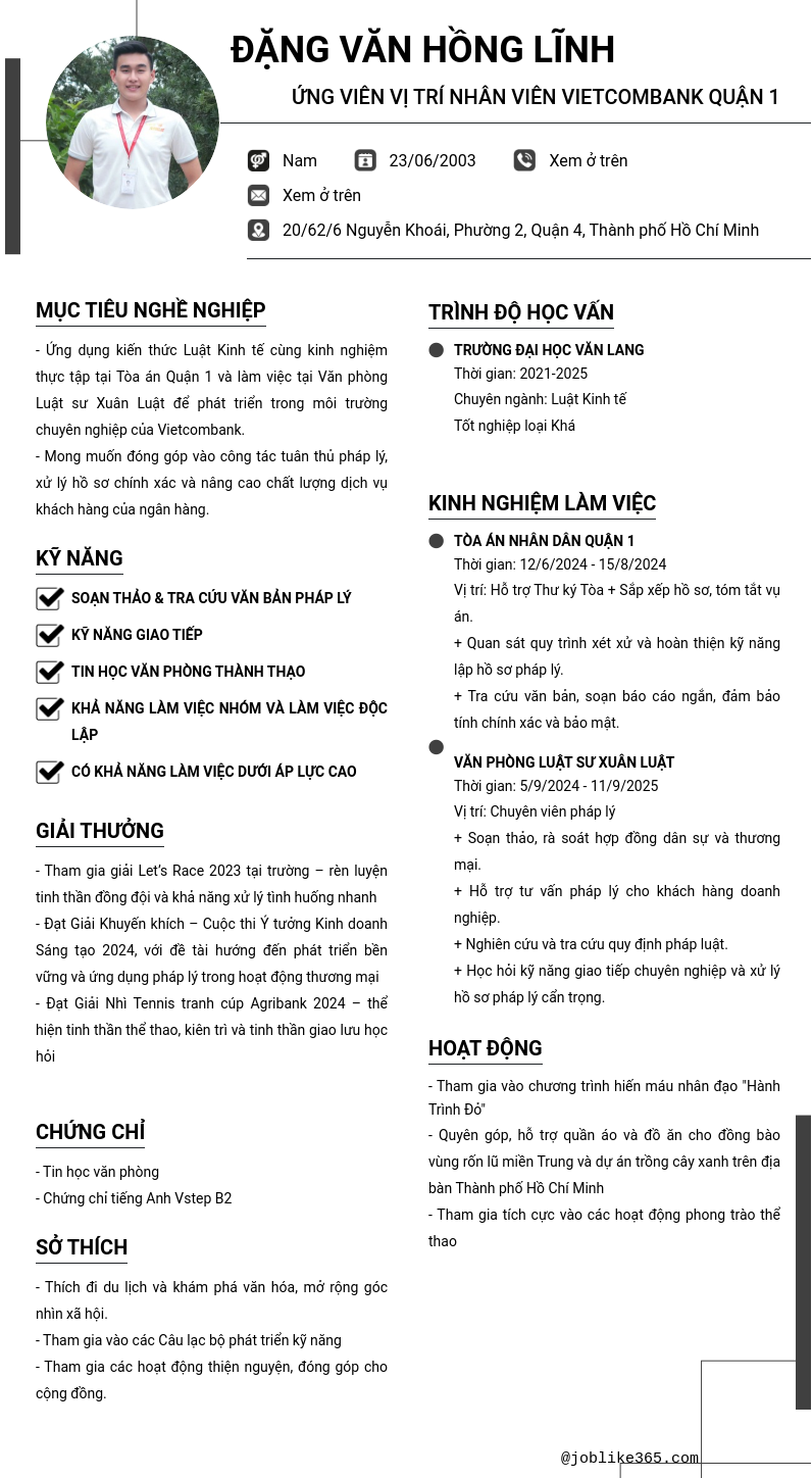 Ứng viên vị trí nhân viên vietcombank quận 1