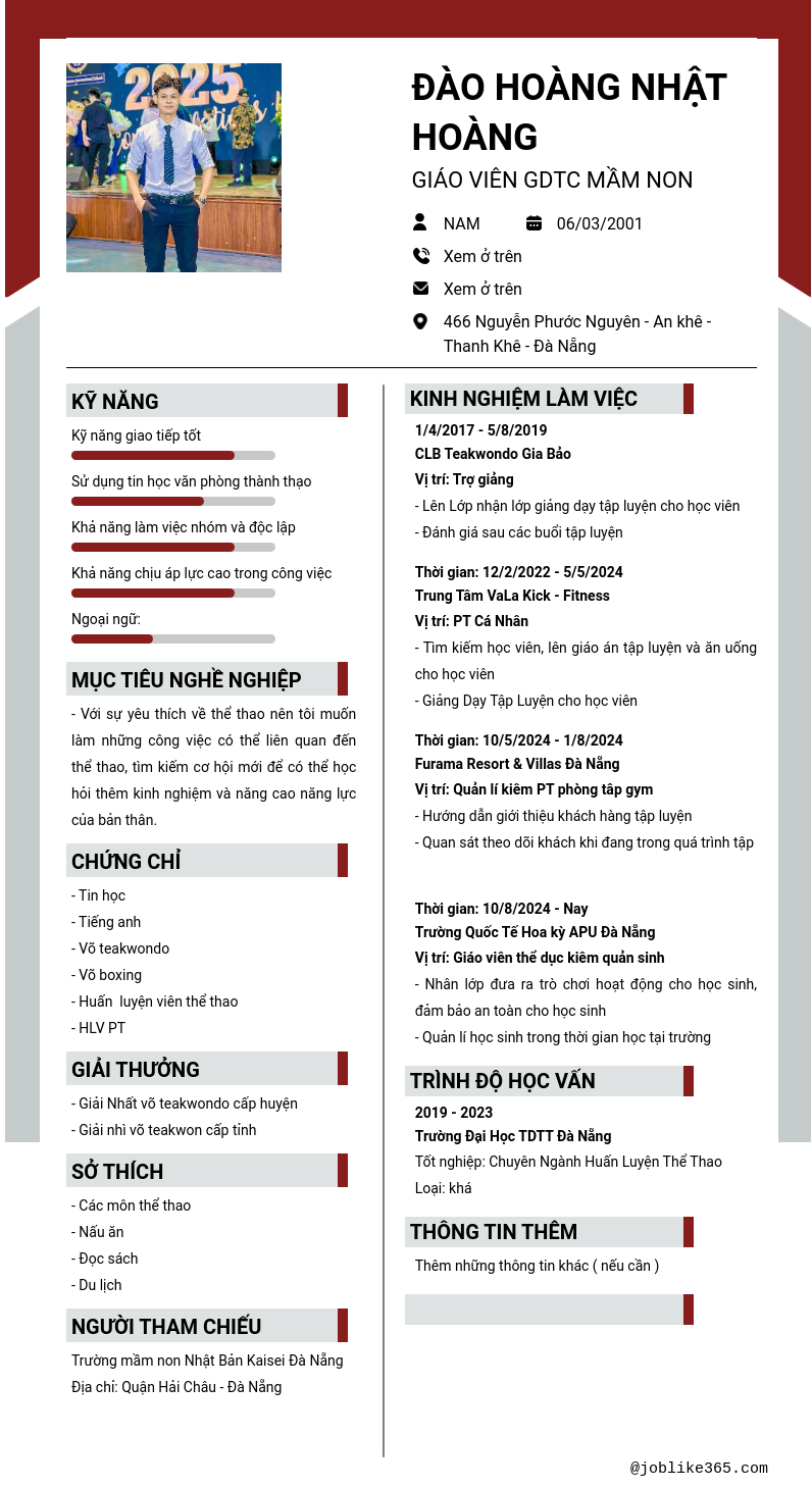 Xem hồ sơ ứng viên ĐÀO HOÀNG NHẬT HOÀNG cần 2 điểm. Hồ sơ được cập nhật ngày: 03/07/2025