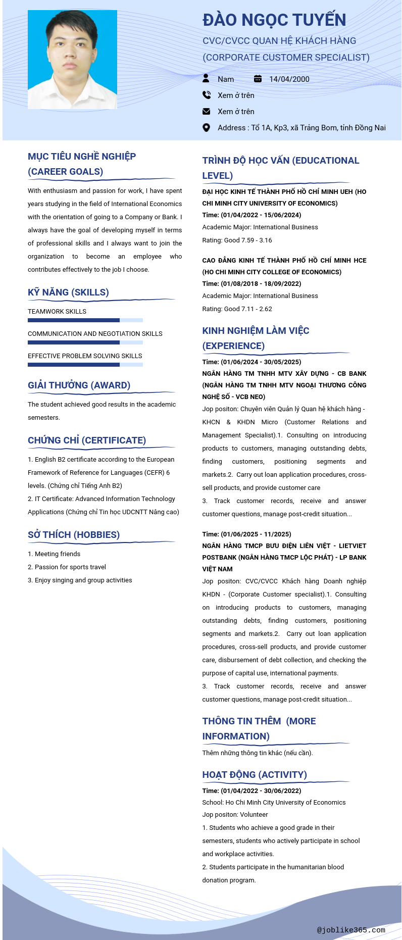 Xem hồ sơ ứng viên ĐÀO NGỌC TUYẾN cần 2 điểm. Hồ sơ được cập nhật ngày: 20/12/2025