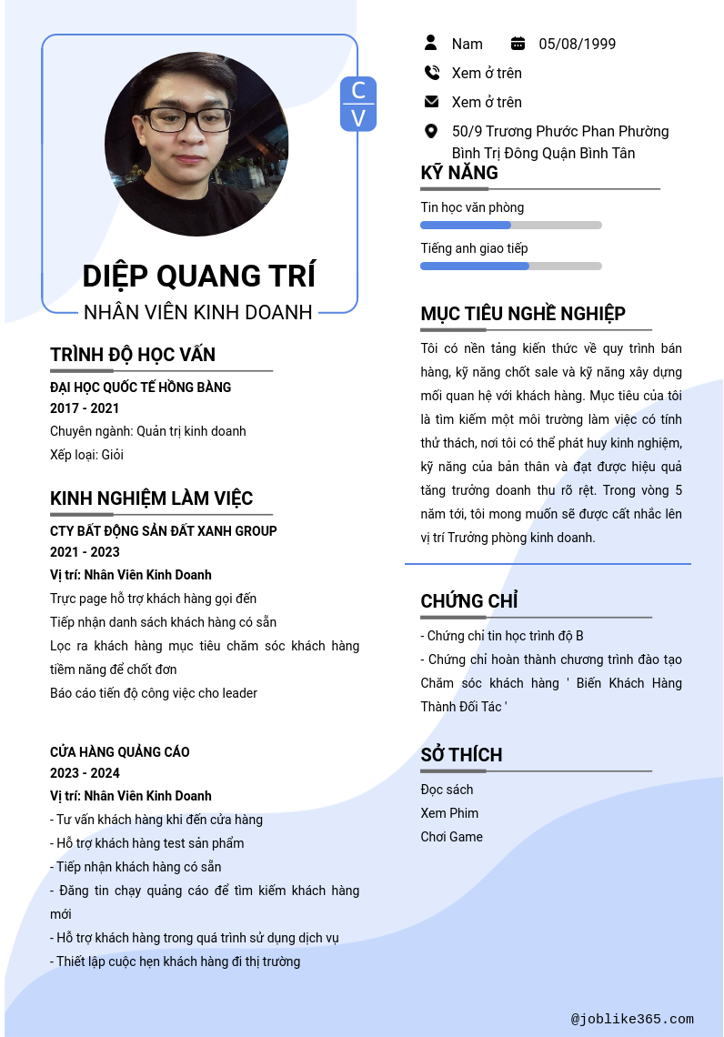 Xem hồ sơ ứng viên DIệp Quang TRÍ cần 2 điểm. Hồ sơ được cập nhật ngày: 05/05/2025