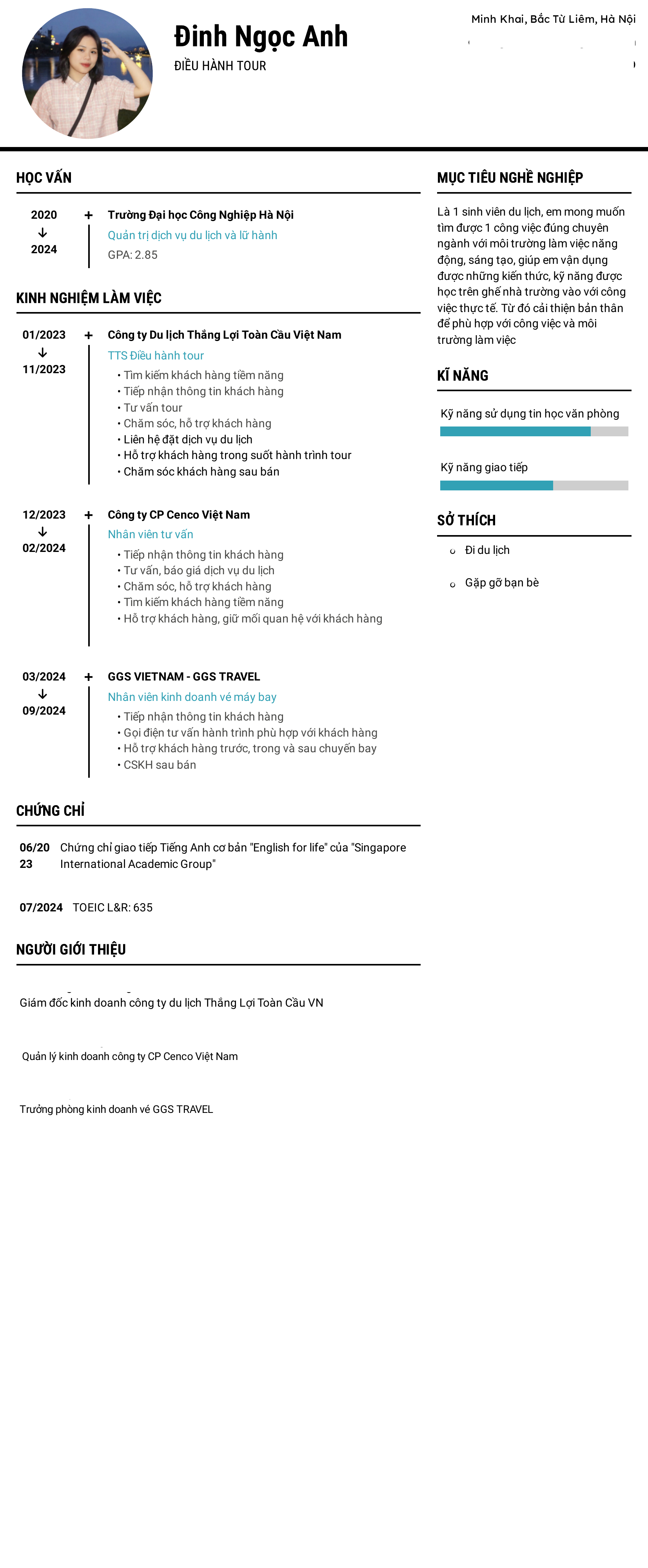 Xem hồ sơ ứng viên Đinh Ngọc Anh cần 2 điểm. Hồ sơ được cập nhật ngày: 21/11/2024
