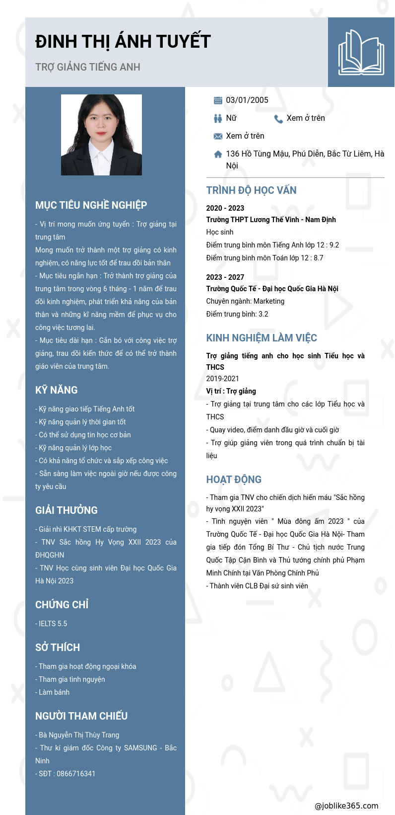 Xem hồ sơ ứng viên ĐINH THỊ ÁNH TUYẾT cần 2 điểm. Hồ sơ được cập nhật ngày: 04/07/2024