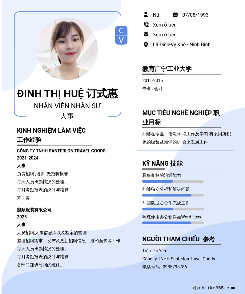 Xem hồ sơ ứng viên Đinh Thị Huệ 订式惠 cần 2 điểm. Hồ sơ được cập nhật ngày: 23/09/2025
