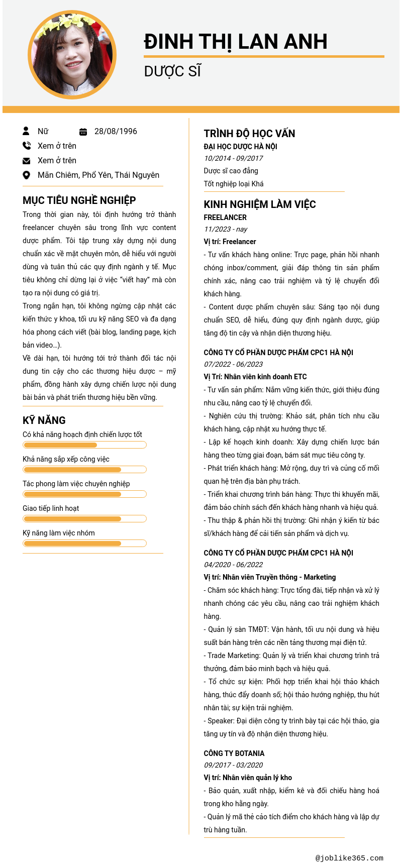 Xem hồ sơ ứng viên đinh thị lan anh cần 2 điểm. Hồ sơ được cập nhật ngày: 31/03/2026