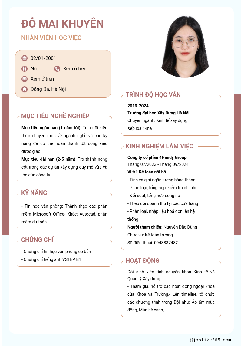 Xem hồ sơ ứng viên ĐỖ MAI KHUYÊN cần 2 điểm. Hồ sơ được cập nhật ngày: 26/09/2024