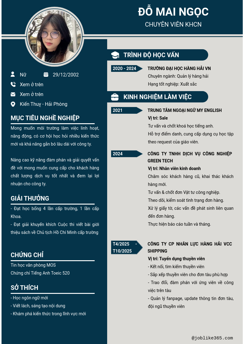 Xem hồ sơ ứng viên ĐỖ MAI NGỌC cần 2 điểm. Hồ sơ được cập nhật ngày: 23/02/2026