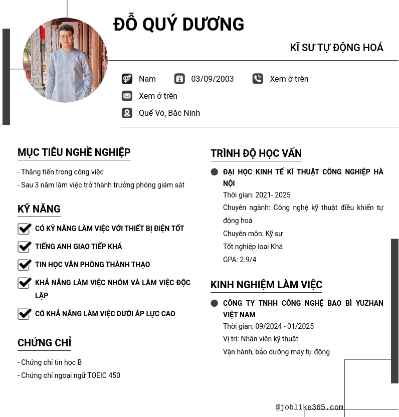 Xem hồ sơ ứng viên Đỗ Quý Dương cần 2 điểm. Hồ sơ được cập nhật ngày: 11/10/2024