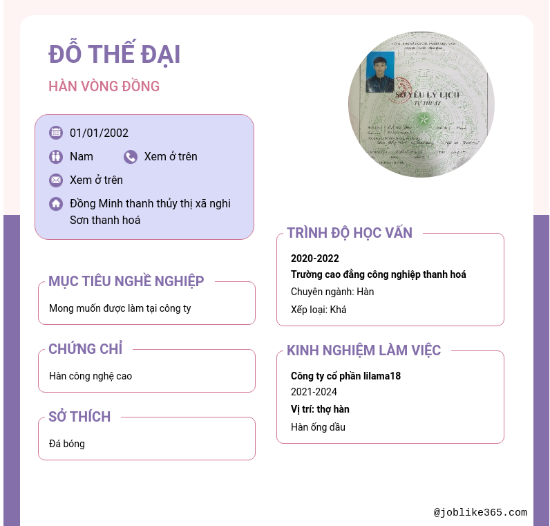Xem hồ sơ ứng viên Đỗ Thế Đại cần 2 điểm. Hồ sơ được cập nhật ngày: 28/02/2025