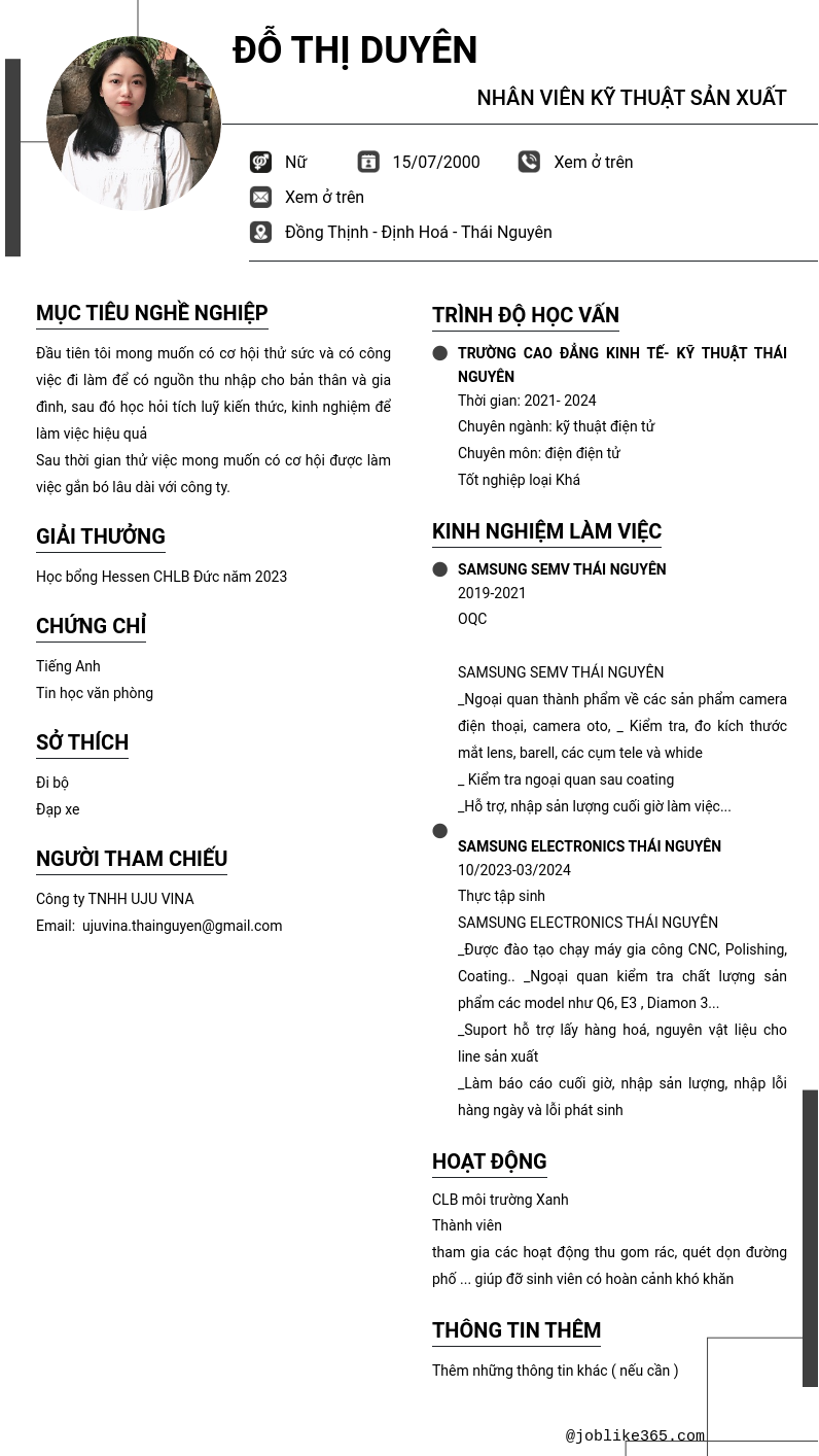 Xem hồ sơ ứng viên ĐỖ THỊ DUYÊN cần 2 điểm. Hồ sơ được cập nhật ngày: 26/09/2024