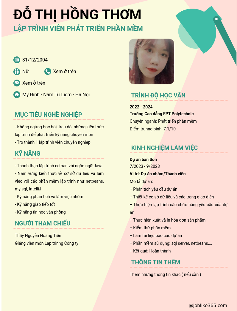 Xem hồ sơ ứng viên ĐỖ THỊ HỒNG THƠM cần 2 điểm. Hồ sơ được cập nhật ngày: 18/07/2024
