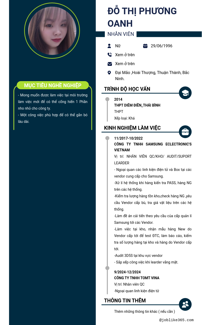 Xem hồ sơ ứng viên ĐỖ THỊ PHƯƠNG OANH cần 2 điểm. Hồ sơ được cập nhật ngày: 04/02/2025