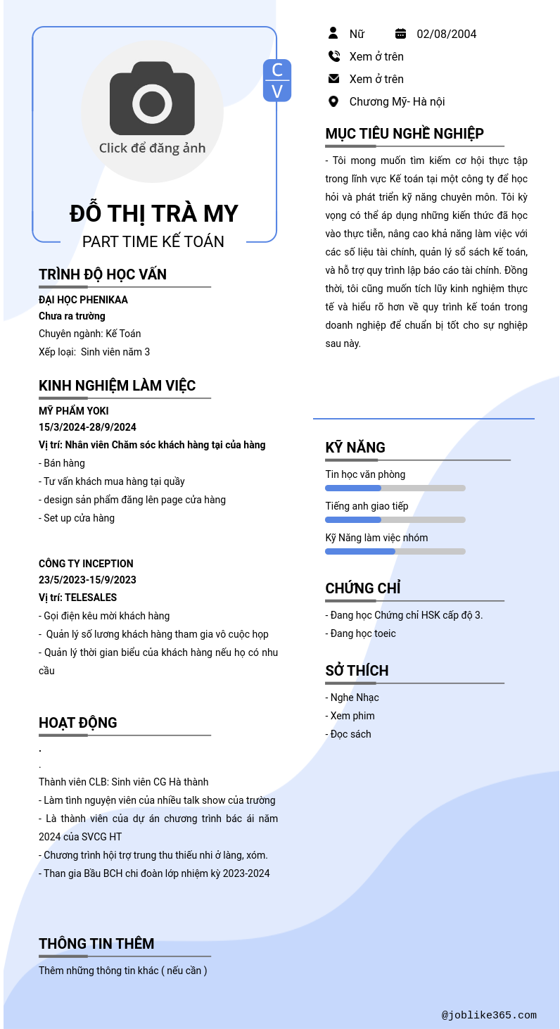 Xem hồ sơ ứng viên Đỗ thị trà my cần 2 điểm. Hồ sơ được cập nhật ngày: 21/10/2024