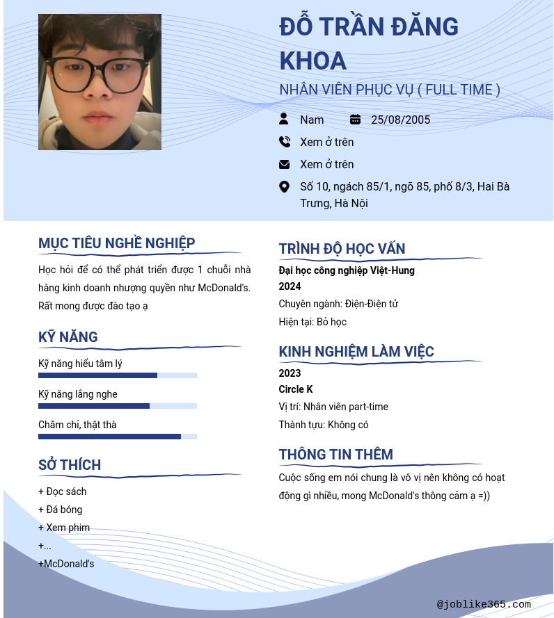 Xem hồ sơ ứng viên Đỗ Trần Đăng Khoa cần 2 điểm. Hồ sơ được cập nhật ngày: 10/08/2024