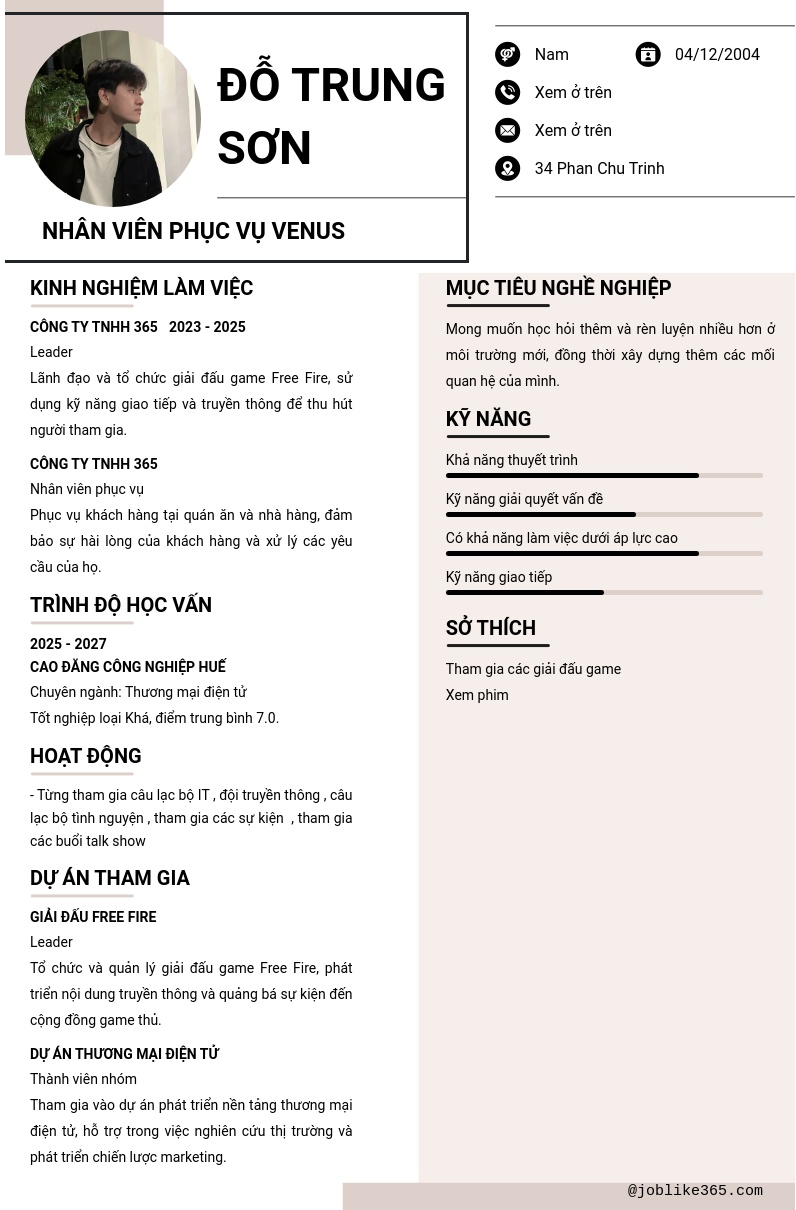 Xem hồ sơ ứng viên Đỗ Trung Sơn cần 2 điểm. Hồ sơ được cập nhật ngày: 12/05/2025