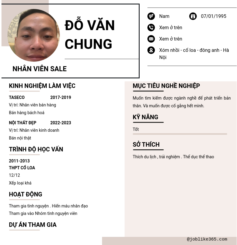 Xem hồ sơ ứng viên Đỗ văn chung cần 2 điểm. Hồ sơ được cập nhật ngày: 29/07/2024