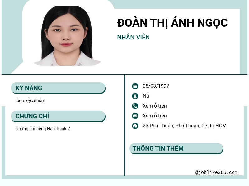 Xem hồ sơ ứng viên Đoàn Thị Ánh Ngọc cần 2 điểm. Hồ sơ được cập nhật ngày: 09/01/2025