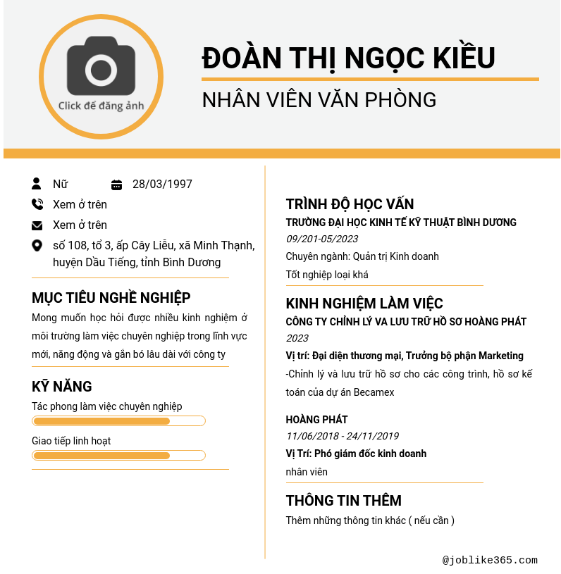 Xem hồ sơ ứng viên đoàn thị ngọc kiều cần 2 điểm. Hồ sơ được cập nhật ngày: 20/09/2024