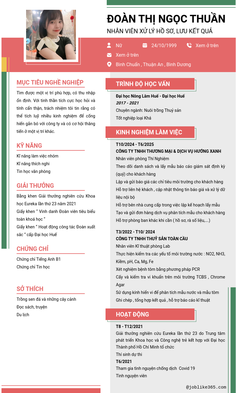 Xem hồ sơ ứng viên Đoàn Thị Ngọc Thuần cần 2 điểm. Hồ sơ được cập nhật ngày: 26/03/2026