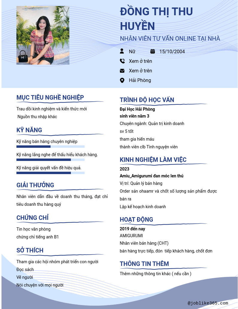Xem hồ sơ ứng viên Đồng THỊ THU Huyền cần 2 điểm. Hồ sơ được cập nhật ngày: 10/08/2024
