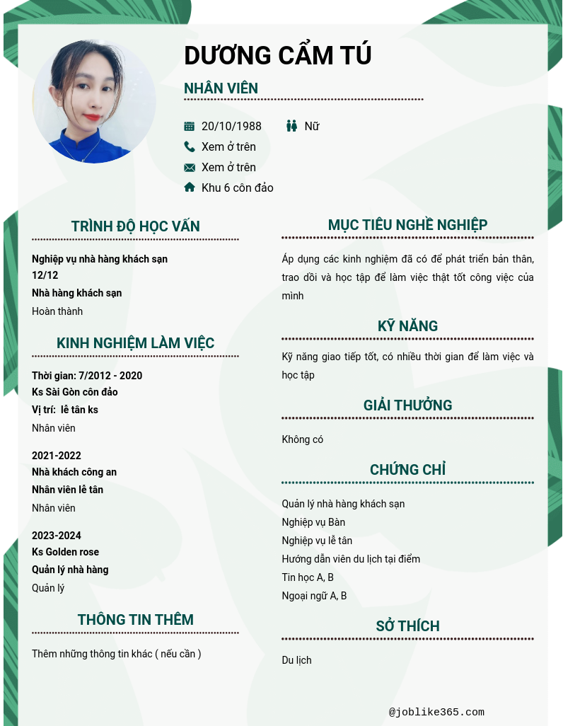 Xem hồ sơ ứng viên Dương cẩm tú cần 2 điểm. Hồ sơ được cập nhật ngày: 01/03/2025