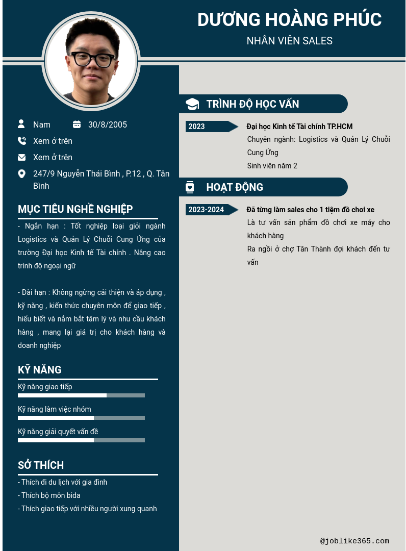 Xem hồ sơ ứng viên Dương Hoàng Phúc cần 2 điểm. Hồ sơ được cập nhật ngày: 01/11/2024