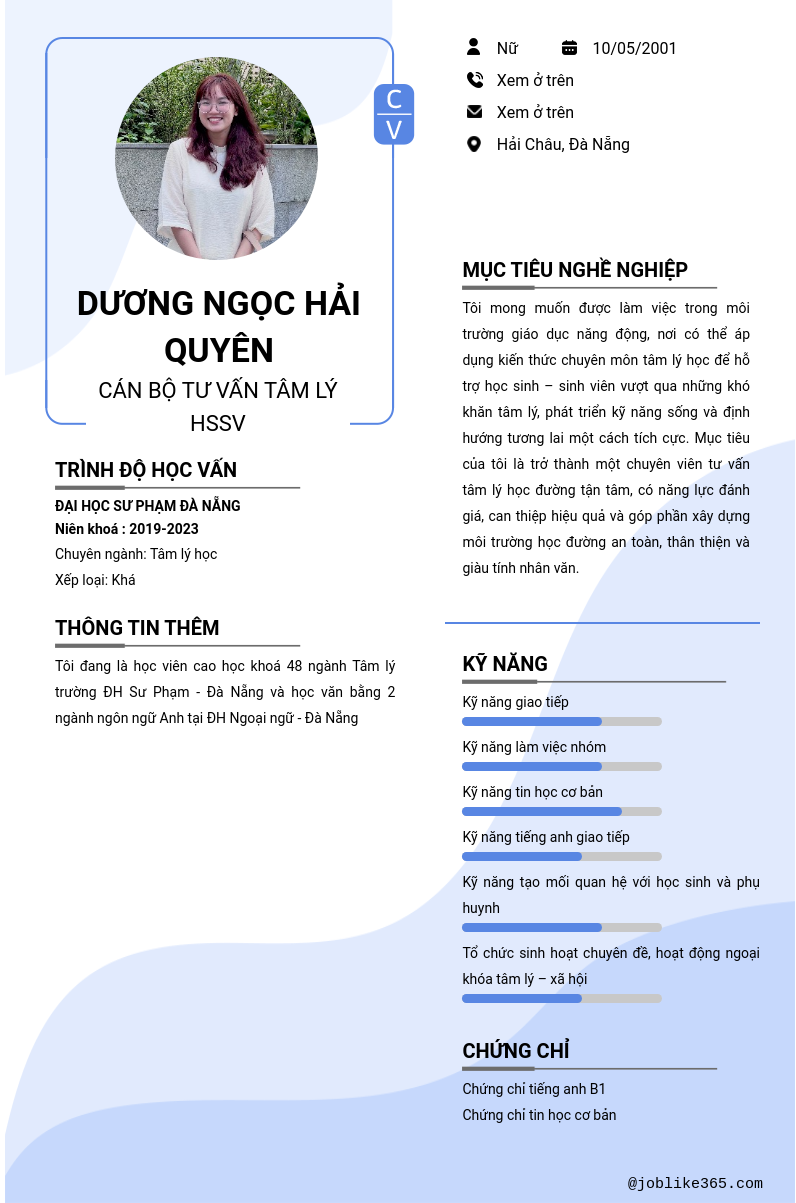 Xem hồ sơ ứng viên Dương Ngọc Hải Quyên cần 2 điểm. Hồ sơ được cập nhật ngày: 09/06/2025