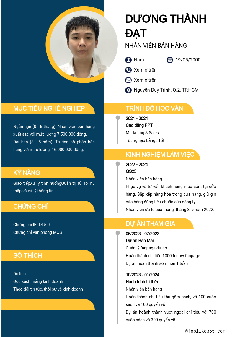 Xem hồ sơ ứng viên DƯƠNG THÀNH ĐẠT cần 2 điểm. Hồ sơ được cập nhật ngày: 01/04/2024