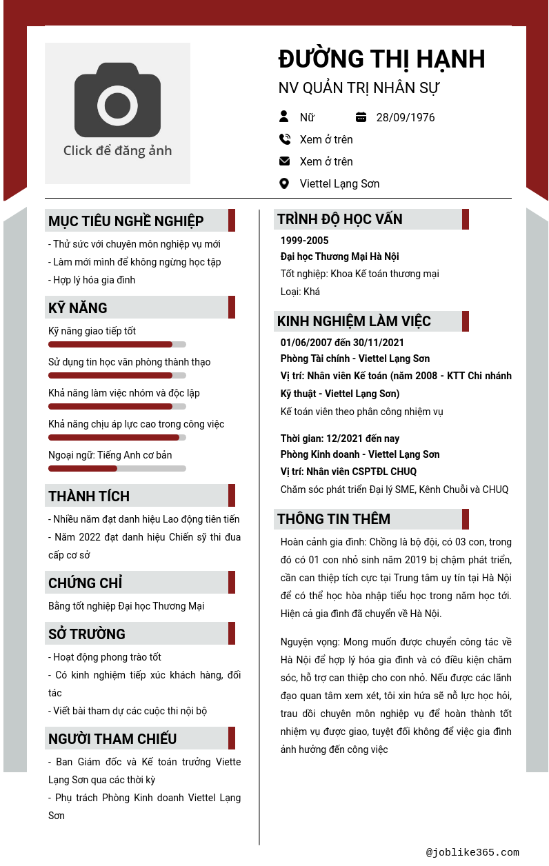 Xem hồ sơ ứng viên ĐƯỜNG THỊ HẠNH cần 2 điểm. Hồ sơ được cập nhật ngày: 08/11/2024
