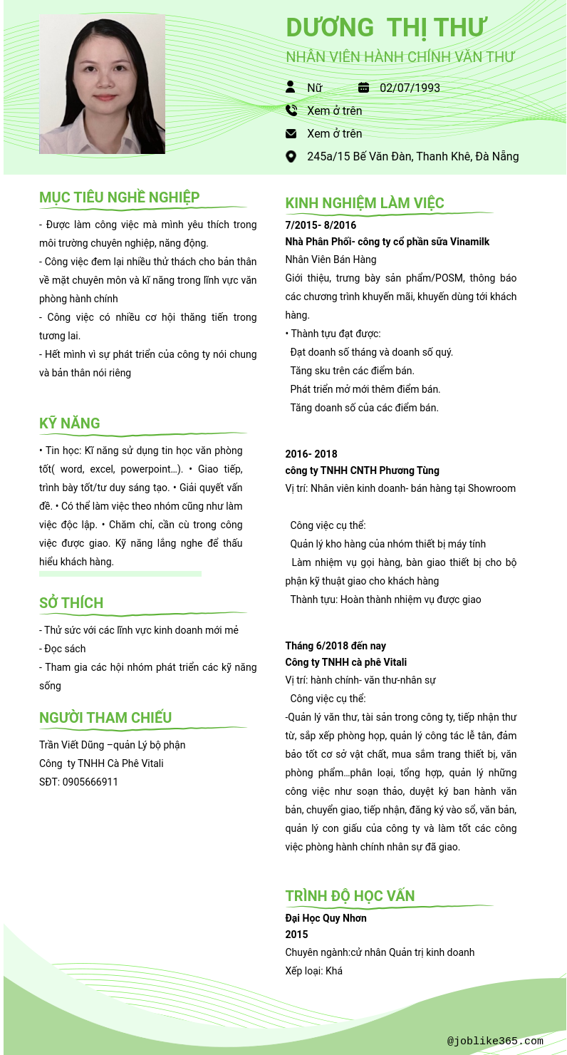 Xem hồ sơ ứng viên DƯƠNG THỊ THƯ cần 2 điểm. Hồ sơ được cập nhật ngày: 23/08/2024