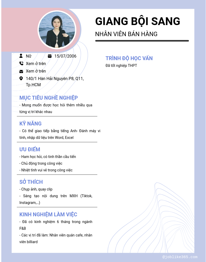 Xem hồ sơ ứng viên Giang Bội Sang cần 2 điểm. Hồ sơ được cập nhật ngày: 24/07/2024
