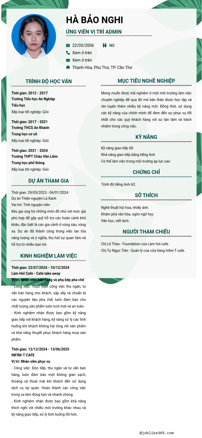 Xem hồ sơ ứng viên Hà Bảo Nghi cần 2 điểm. Hồ sơ được cập nhật ngày: 21/10/2025